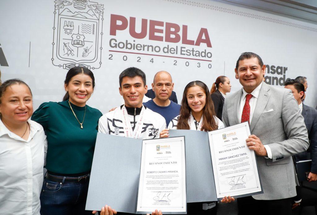 Tras el anuncio de lo que está por venir para Puebla como sede de Olimpiada Nacional, el gobernador Alejandro Armenta, entregó reconocimientos a dos doble medallistas de Atletismo: Miriam Sánchez Tapia quien obtuvo preseas de oro en los 100 metros planos y 200 metros planos, además de implantar récords nacionales en ambas distancias en la categoría sub-23, y a Roberto Cázares Miranda al lograr presea de oro en los 10 mil metros planos y plata en los 5 mil metros planos dentro de la categoría sub-20.