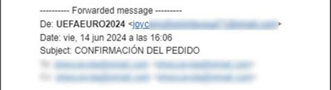 El correo electrónico tiene por título “¡No pierdas la oportunidad de ganar entradas para ver los partidos de la EURO 2024 en vivo! Participa en nuestro concurso”. Sin embargo, al analizar que el remitente UEFAEURO2024, se puede observar que la dirección de correo es una cuenta personal.