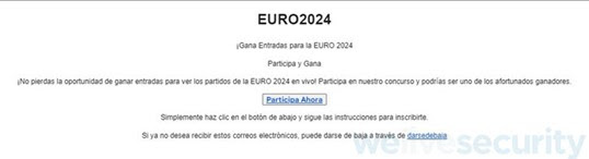 Correos de phishing: A pesar de ser de las técnicas más reutilizadas por los cibercriminales, su efectividad e impacto siguen dando de qué hablar. En este caso hacen creer a las personas que su dirección de correo ha entrado en un sorteo para poder disfrutar partidos la Eurocopa 2024.