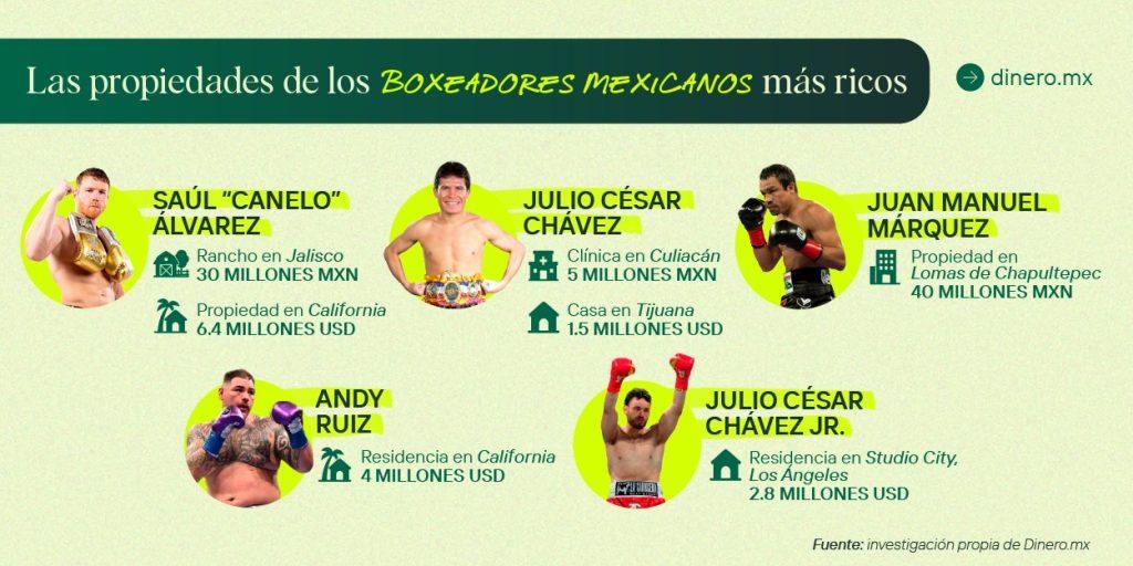 Canelo Álvarez es el boxeador mexicano con mayor fortuna estimada. Forbes calculó su patrimonio en 275 millones de dólares y destaca que ha obtenido casi 600 millones de dólares en ganancias de carrera antes de impuestos. Su cartera inmobiliaria incluye: