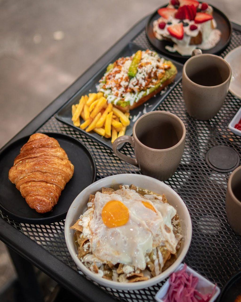 El pan es protagonista. Hay croissants de mantequilla que se convierten en plato fuerte: rellenos de jamón con queso manchego y cebolla caramelizada, de huevo estrellado y tocino, o en el bocado serrano, que reúne arúgula, jitomate deshidratado, higo, jamón serrano y queso crema. Los toast se construyen sobre rebanadas gruesas de hogaza de masa madre horneada cada día, con aguacate, salmón, machaca, roast beef, jamón serrano o combinaciones con brotes, frutos secos, cremosos y quesos de cabra.