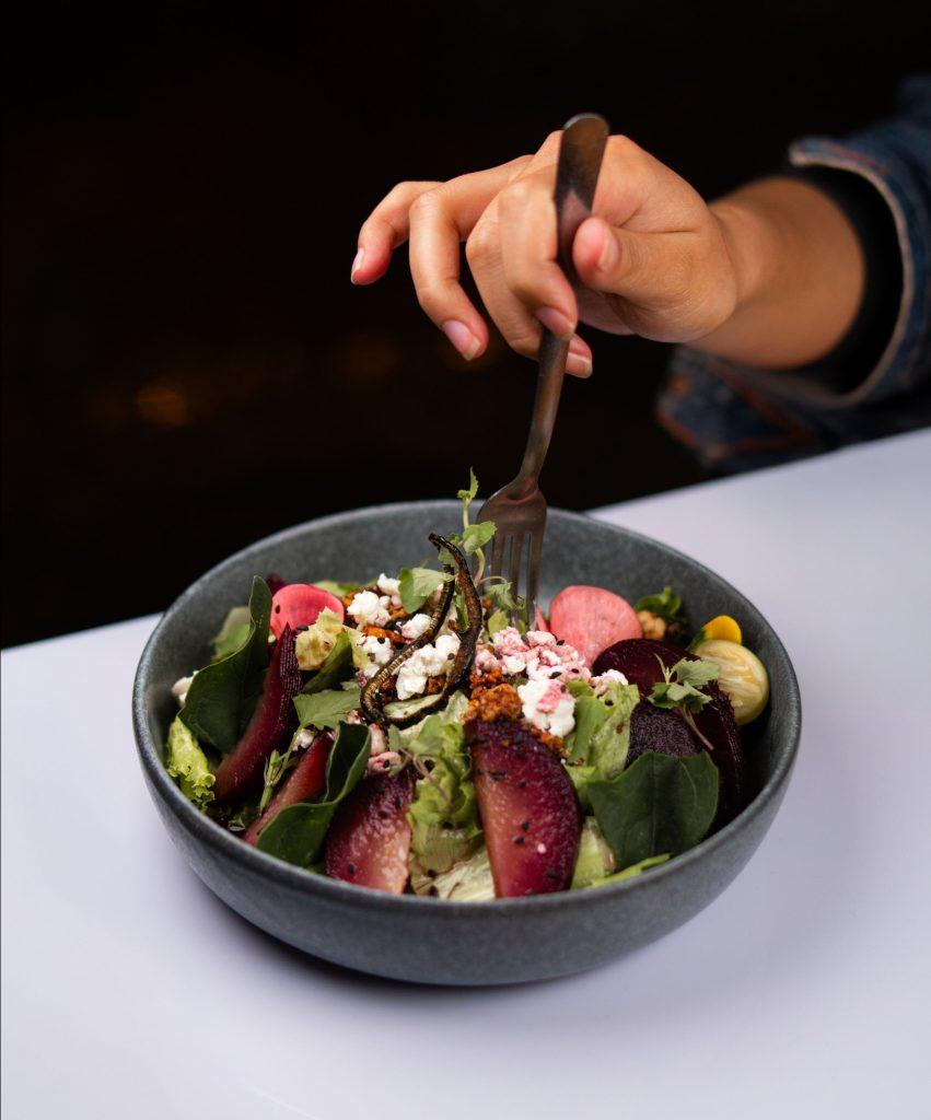 Las ensaladas están hechas con lechugas y espinaca hidropónica. Hay combinaciones ligeras con brotes, pera al vino, nuez caramelizada, queso de cabra y frutos de temporada, o mezclas más completas como la de pollo a la plancha con queso feta, aguacate y cacahuate. Las entradas también acompañan bien una comida compartida: papas sucias con queso y tocino, tostadas de betabel rostizado con cottage y nuez, o croquetas de jamón ibérico con alioli de ajo asado.