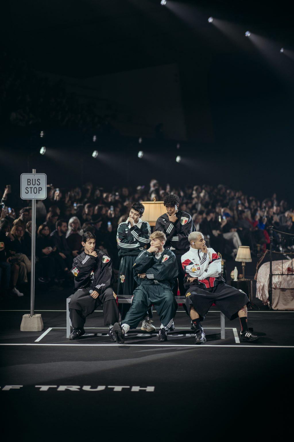 En uno de los momentos más vibrantes del desfile, el grupo interpreta su primer sencillo “0%”, fusionándose de manera orgánica con el universo creativo del show.